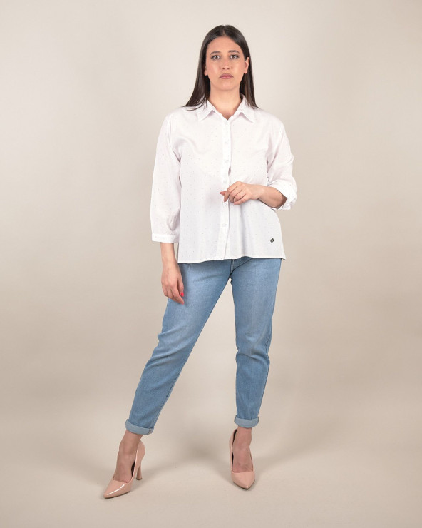 Un capo versatile e luminoso pensato per valorizzare ogni outfit con eleganza. Questa camicia in 100% cotone è arricchita da delicati strass applicati che donano un raffinato effetto luce, perfetto per chi ama i dettagli ricercati. Il taglio morbido e la manica 3/4 garantiscono comfort e uno stile contemporaneo, ideale sia per la quotidianità che per occasioni più formali. Il colletto classico e la chiusura con bottoni completano il design, rendendola adatta a diversi abbinamenti: perfetta su un jeans per un look casual chic o su un pantalone elegante per l’ufficio.