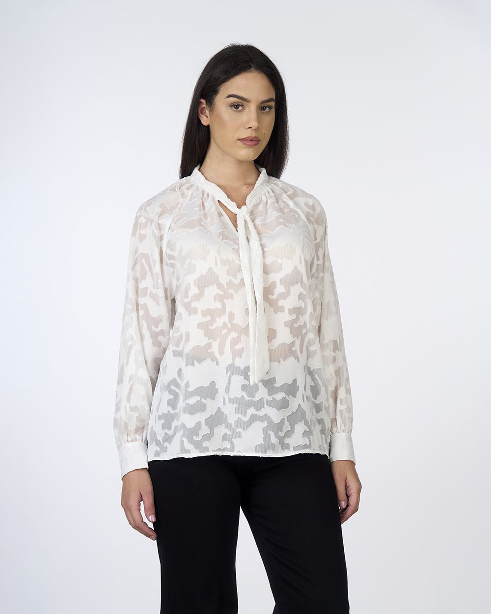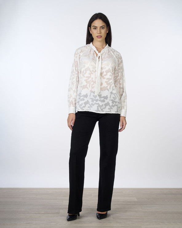 Questa blusa jacquard è un capo elegante e raffinato, perfetto per valorizzare con stile ogni occasione. Realizzata in tessuto leggero con lavorazione trasparente a motivo, dona movimento e un tocco sofisticato al look. Lo scollo arricchito da fiocco da annodare rende il modello femminile e romantico, mentre le maniche lunghe con polsini strutturati garantiscono un finish ordinato e di classe.