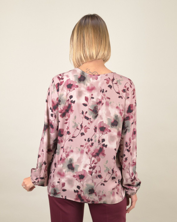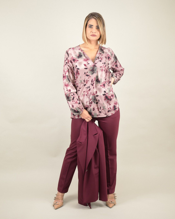 Il modello presenta una linea svasata che valorizza le forme senza costringere, scollo a V con piega centrale e maniche lunghe leggermente ampie con polsino elasticizzato, per un effetto elegante e contemporaneo. La delicata fantasia floreale rende questa blusa ideale per look da giorno e da sera, facile da abbinare a pantaloni sartoriali o gonne per un’eleganza naturale e senza tempo.