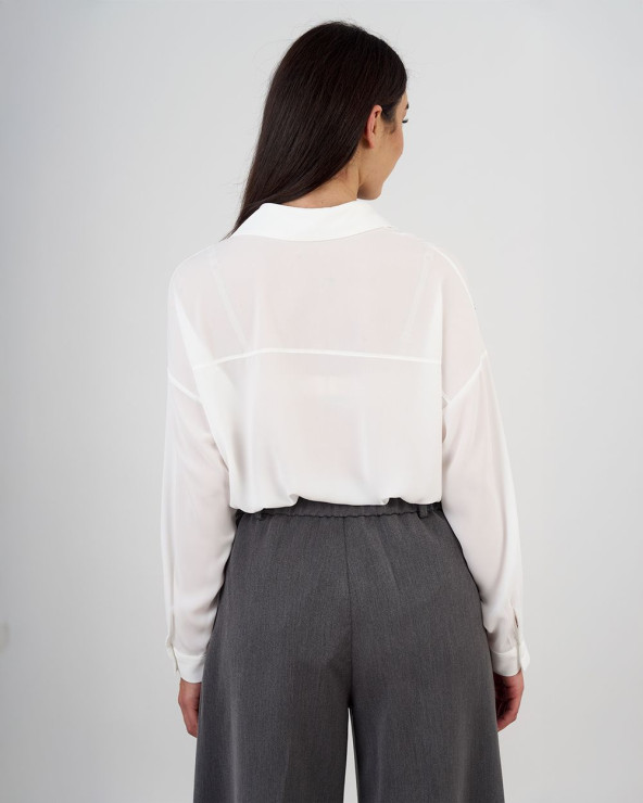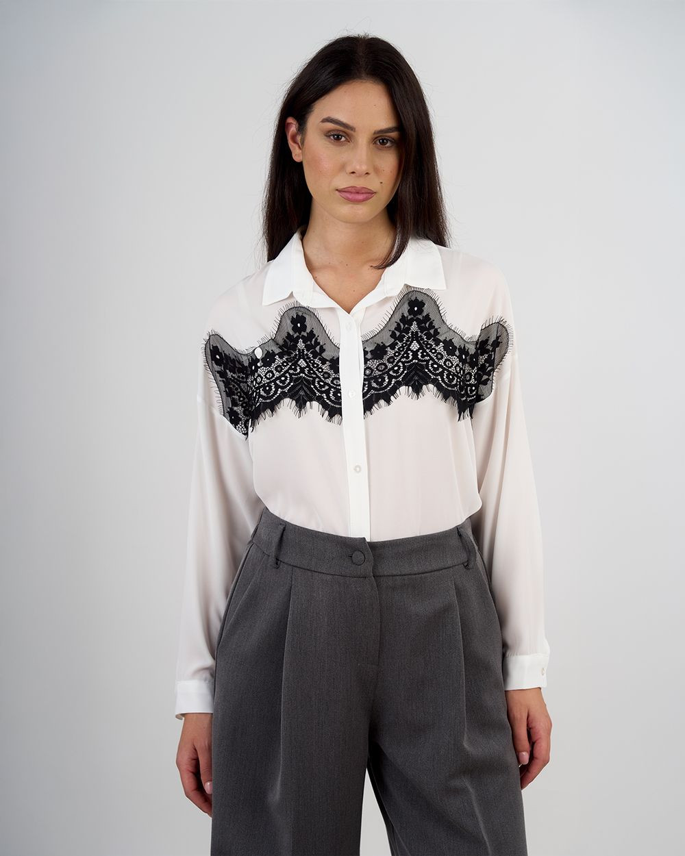 Il colletto classico e l’abbottonatura frontale la rendono perfetta per ogni occasione, mentre il prezioso inserto in pizzo nero sul davanti aggiunge un tocco di romanticismo e sofisticazione. Le maniche lunghe con polsino abbottonato completano il look con sobria eleganza.