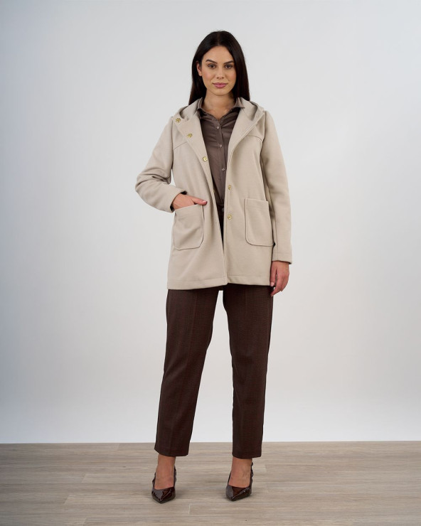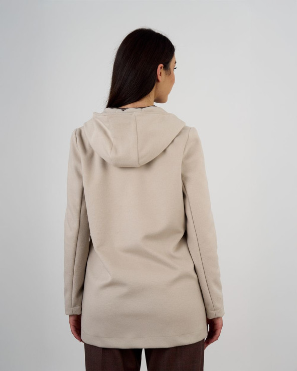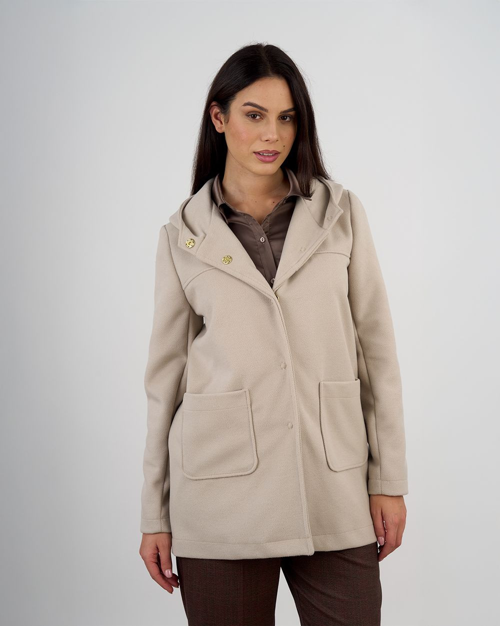 Il modello presenta un cappuccio ampio, chiusura frontale con bottoni a pressione nascosti e tasche applicate che uniscono praticità e raffinatezza.