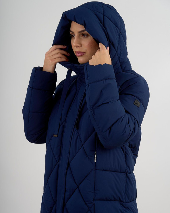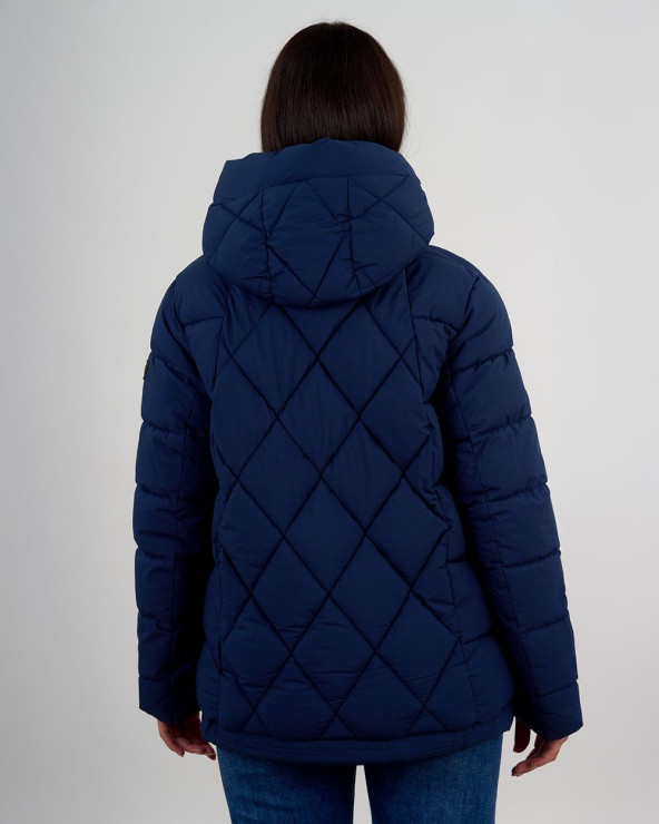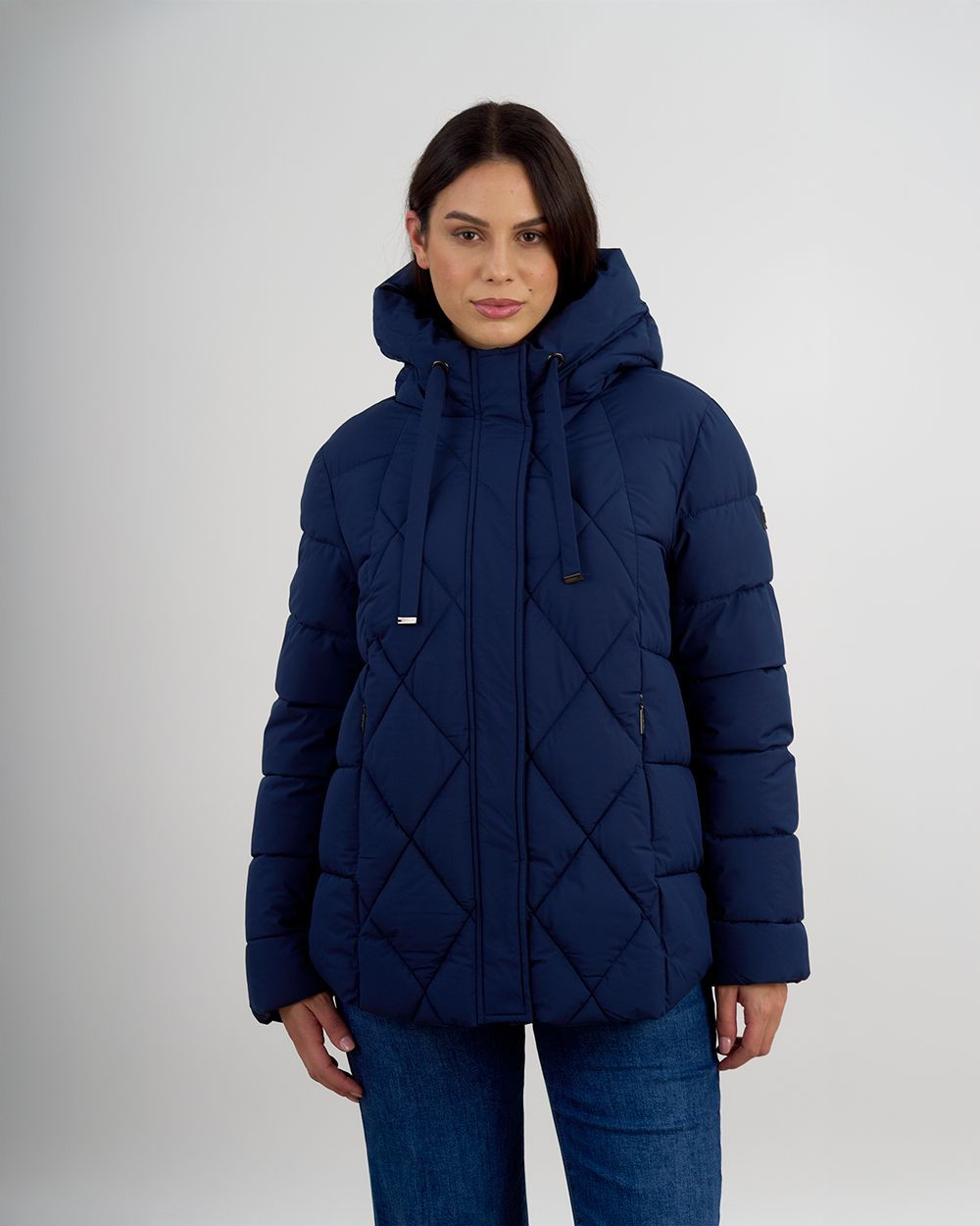 Realizzato in tessuto trapuntato effetto rombo, presenta un ampio cappuccio con coulisse regolabile, chiusura con zip nascosta e tasche laterali con zip.