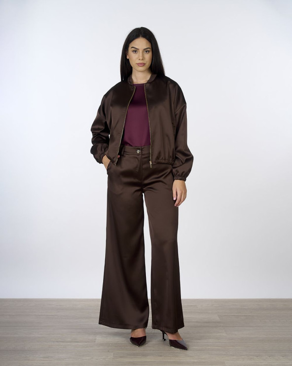 La giacca bomber in raso marrone è un capo contemporaneo e sofisticato, ideale per aggiungere un tocco moderno e ricercato al guardaroba femminile. Realizzata in tessuto lucido, questa giacca si distingue per la sua linea morbida e fluida che garantisce comfort e libertà di movimento, mantenendo al tempo stesso un aspetto elegante. La chiusura frontale con zip dorata e l’elastico sul fondo e sui polsini donano praticità e valorizzano il design sport-chic del modello.