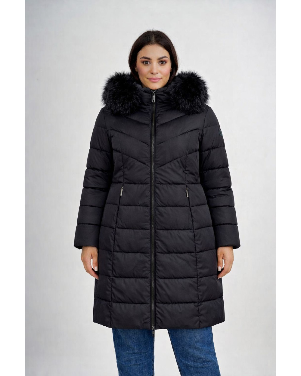 La linea leggermente sfiancata accompagna la silhouette curvy senza costringere, mentre la trapuntatura regolare contribuisce a creare un effetto armonioso e slanciato. Il cappuccio è impreziosito da un elegante bordo in eco pelliccia, che dona un tocco raffinato e contemporaneo, richiamando lo stile dei migliori brand di abbigliamento donna.