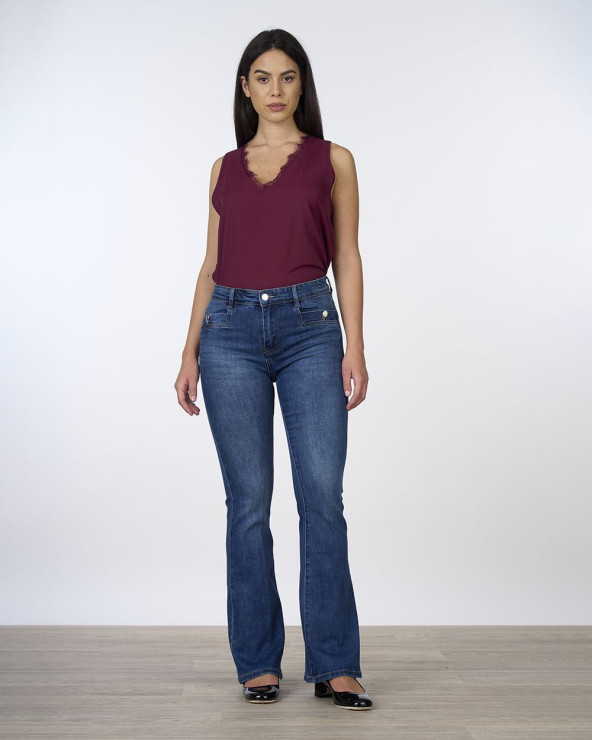 Il denim medio, con leggere sfumature, li rende versatili e adatti a ogni occasione: dall’ufficio al tempo libero, fino agli outfit serali più ricercati. I dettagli delle tasche frontali con bottoni dorati aggiungono un tocco sofisticato e moderno, rendendo questo modello unico e distintivo.