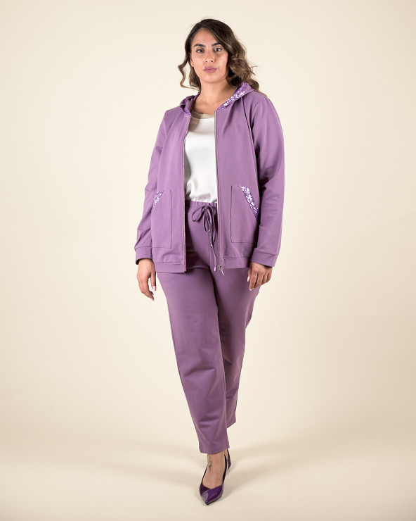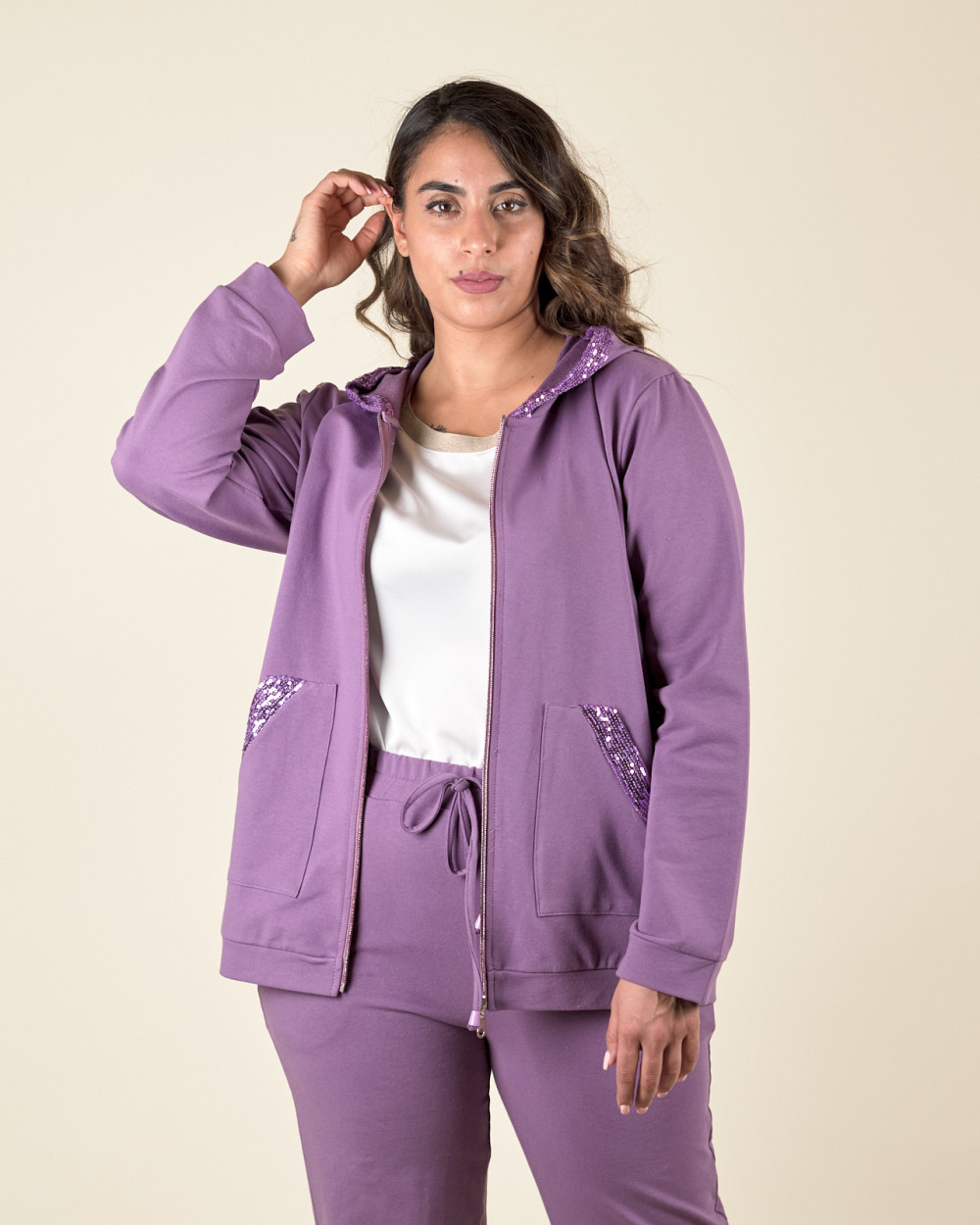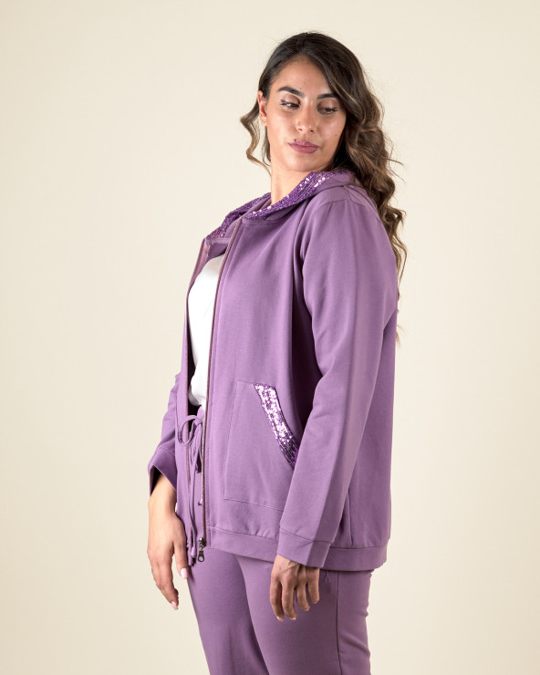 Felpa con profili decorati in paillettes, cappuccio con coulisse e laccetto, due tasche anteriori, chiusura tramite zip a vista.