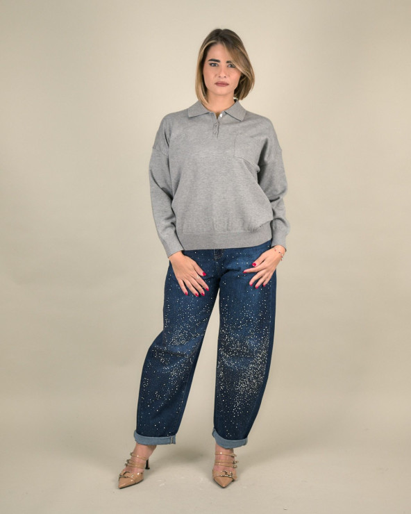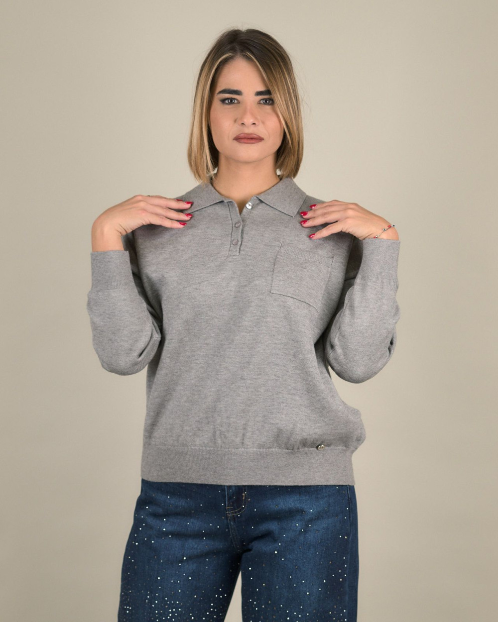 Maglia polo dal taglio morbido e femminile, caratterizzata da colletto classico, chiusura con bottoncini e pratico taschino sul petto.