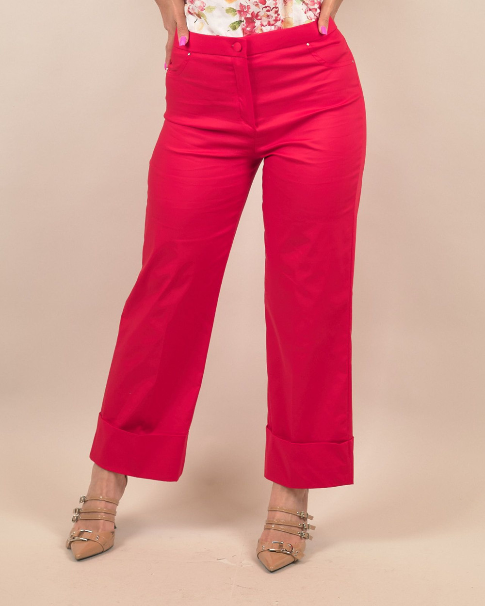 Questi pantaloni uniscono eleganza e praticità in un capo versatile e ricercato. Realizzati in morbido cotone elasticizzato, assicurano una vestibilità confortevole e una linea strutturata pensata per valorizzare ogni silhouette. Il fondo con risvolto ampio aggiunge un tocco sartoriale distintivo, perfetto per completare look da giorno o da ufficio con stile. Il design comprende una chiusura frontale con bottone e zip, tasche laterali e un taglio dritto leggermente morbido alla caviglia, per un equilibrio tra comodità e raffinatezza.