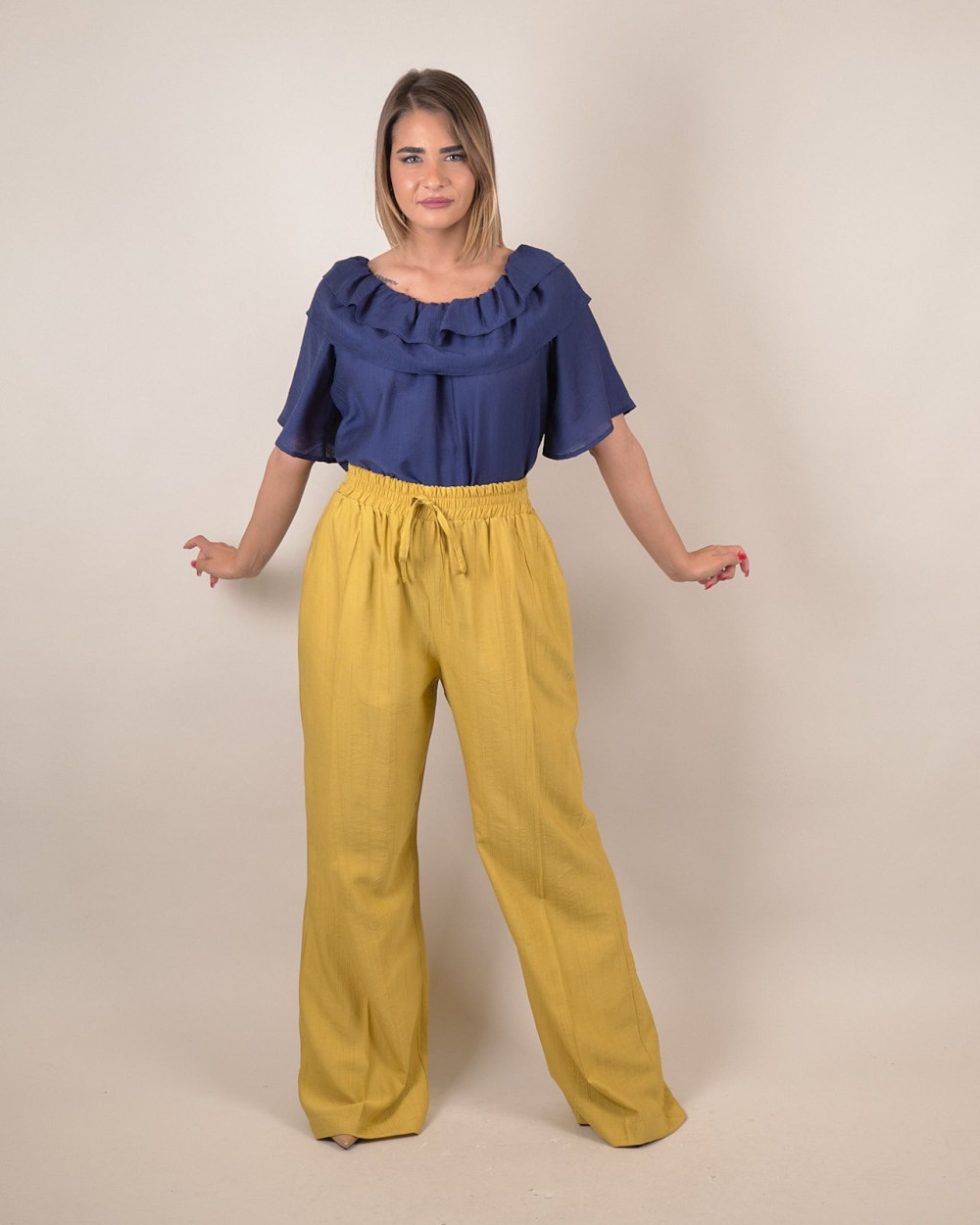 Aggiungi un tocco solare al tuo guardaroba con questi pantaloni palazzo in viscosa senape. Il tessuto leggero e morbido li rende ideali per la stagione calda, offrendo comfort e freschezza per tutto il giorno. La linea ampia e fluida valorizza ogni tipo di silhouette, mentre la vita alta con elastico e coulisse garantisce una vestibilità comoda e regolabile.