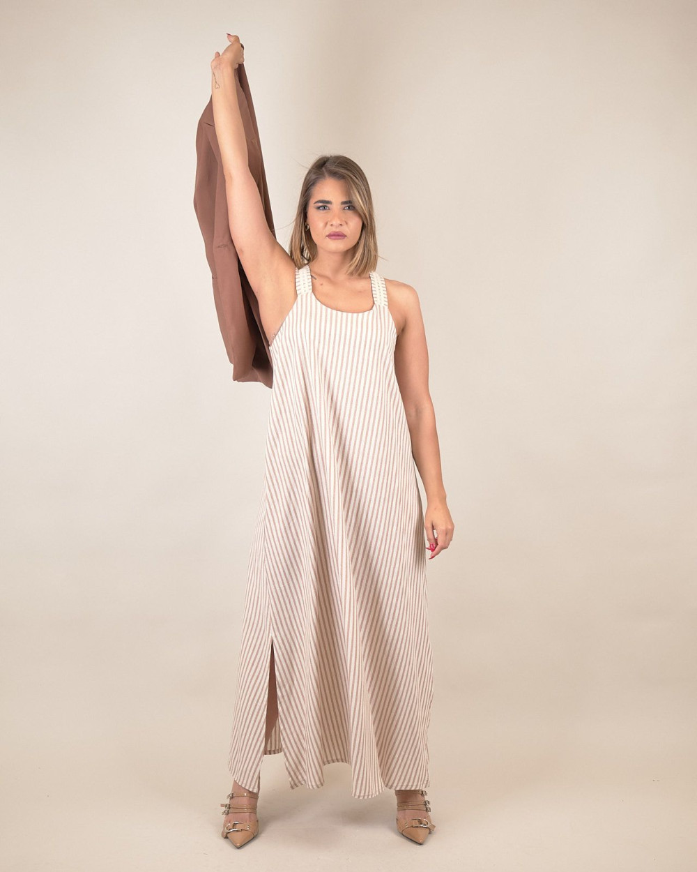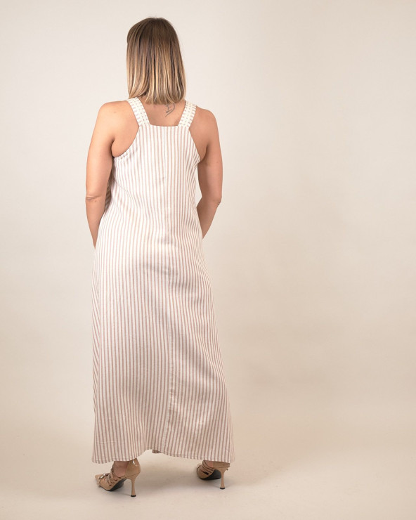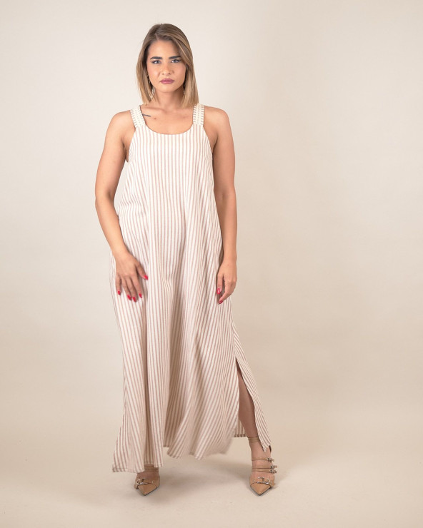 Le spalline larghe intrecciate donano un tocco artigianale e originale al design essenziale, mentre la linea svasata e scivolata accompagna la figura con leggerezza, senza segnare. Le righe verticali slanciano visivamente la silhouette, rendendo il capo adatto anche alla donna curvy.