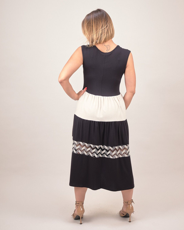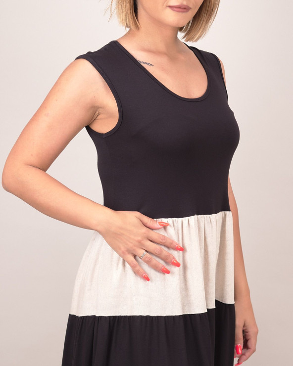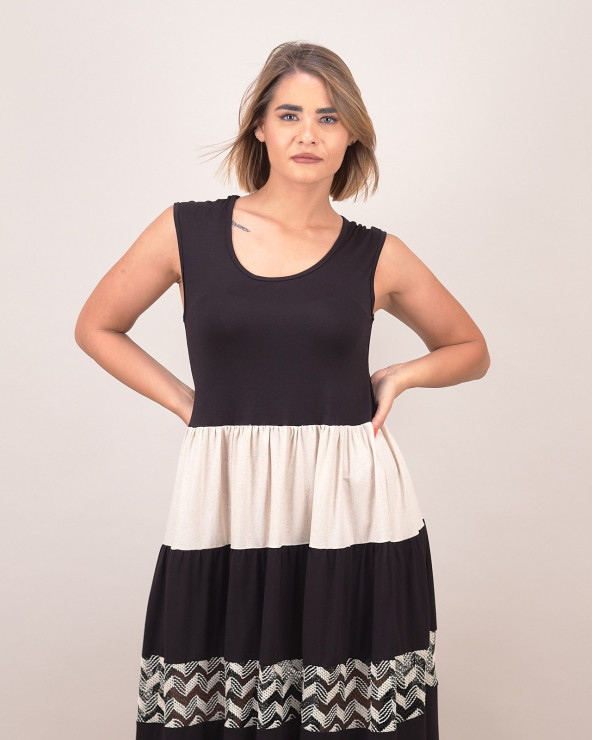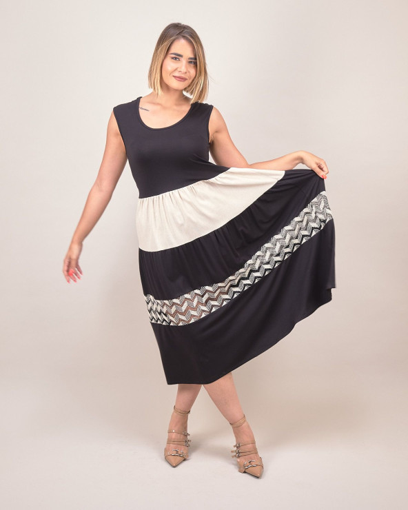 Rinnova il tuo stile estivo con questo abito smanicato bicolor, una perfetta combinazione di eleganza e praticità. Il modello presenta un taglio svasato e una gonna a balze, arricchita da un’originale fascia ricamata a motivo zig-zag che aggiunge un tocco artigianale e distintivo. La parte superiore aderente e semplice in tinta unita si fonde armoniosamente con il contrasto del panna e nero, creando un capo versatile che si adatta a diverse occasioni, dal tempo libero agli eventi informali.