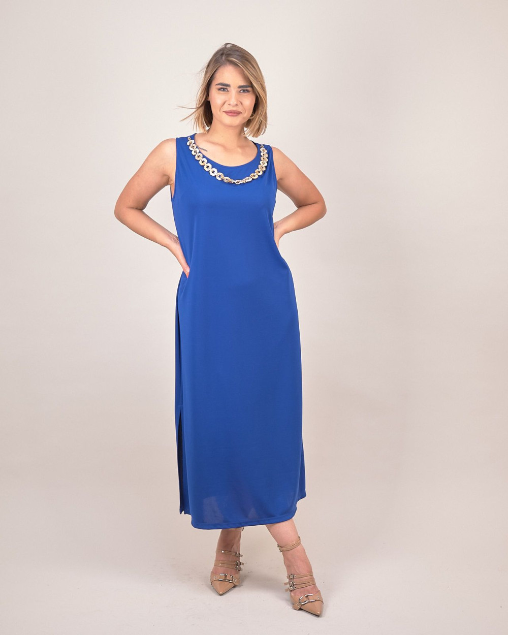 Perfetto da indossare con sandali gioiello o tacchi a stiletto, può essere abbinato a clutch e accessori dorati per un outfit sofisticato. Un must-have nell’abbigliamento donna per chi desidera un vestito lungo dal taglio contemporaneo, comodo e ricercato.