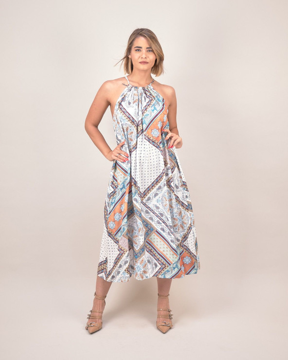 Aggiungi un tocco di eleganza e personalità al tuo guardaroba estivo con questo abito midi a stampa foulard. Caratterizzato da un raffinato scollo all?americana con arricciatura, valorizza spalle e décolleté con un design femminile e sofisticato. Il taglio svasato accompagna dolcemente le forme, regalando comfort e movimento a ogni passo.