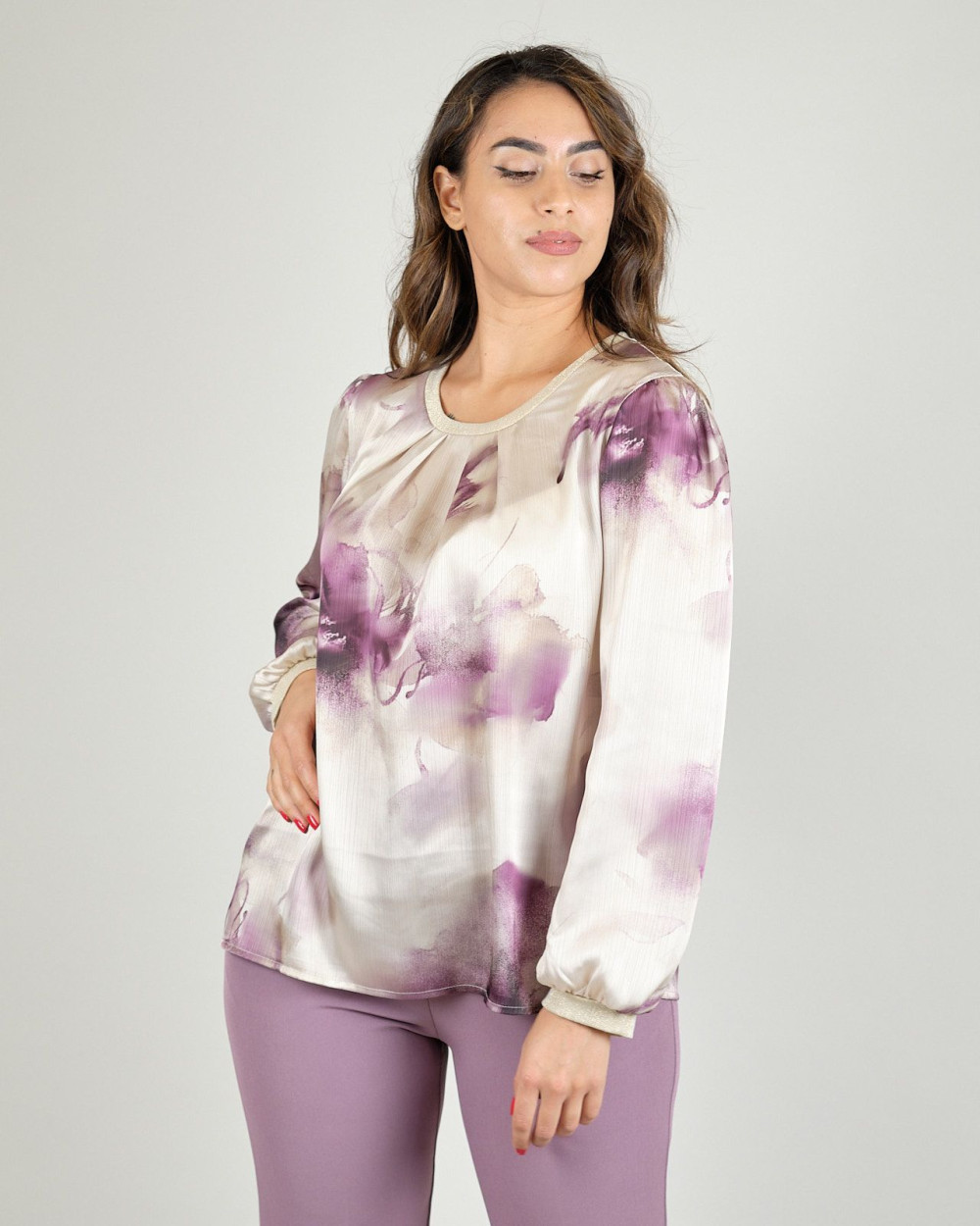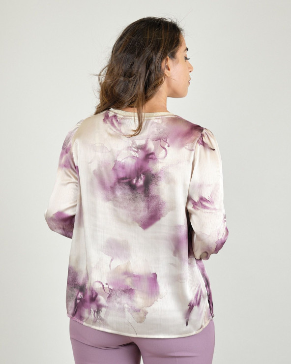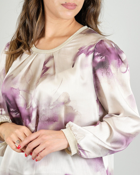 Blusa malva in tessuto di raso con profili in lurex, scollo tondo, linea svasata.