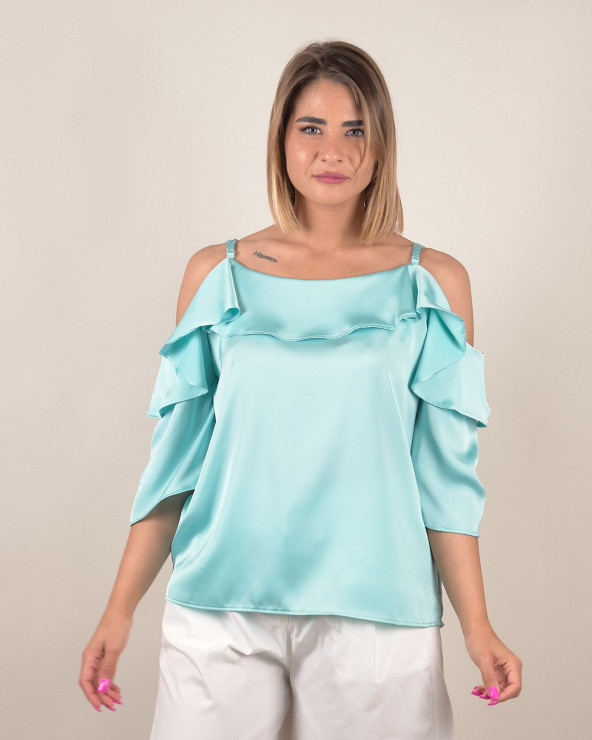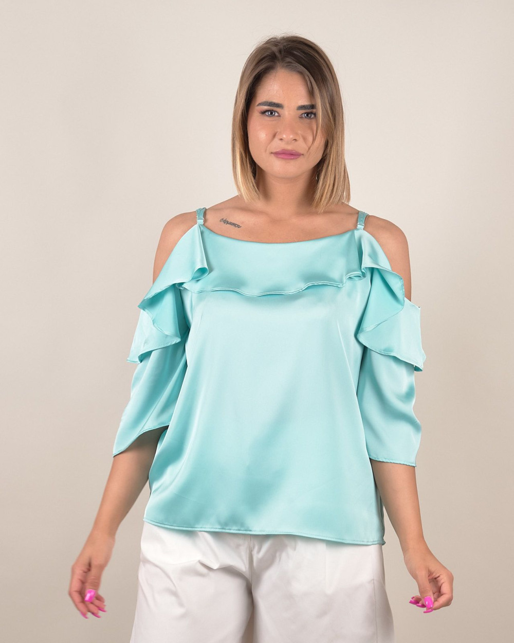 Dal design raffinato e contemporaneo, questa blusa in raso è pensata per esaltare la femminilità con eleganza. Il modello con spalle scoperte e volant applicati sul décolleté e sulle maniche dona un tocco romantico e dinamico, perfetto per le occasioni speciali o per dare un twist sofisticato a un look quotidiano. Il tessuto leggero e fluido accarezza la silhouette senza segnare, garantendo una vestibilità comoda e valorizzante. Indossala con pantaloni a sigaretta per un look elegante, oppure con jeans per un contrasto più casual.