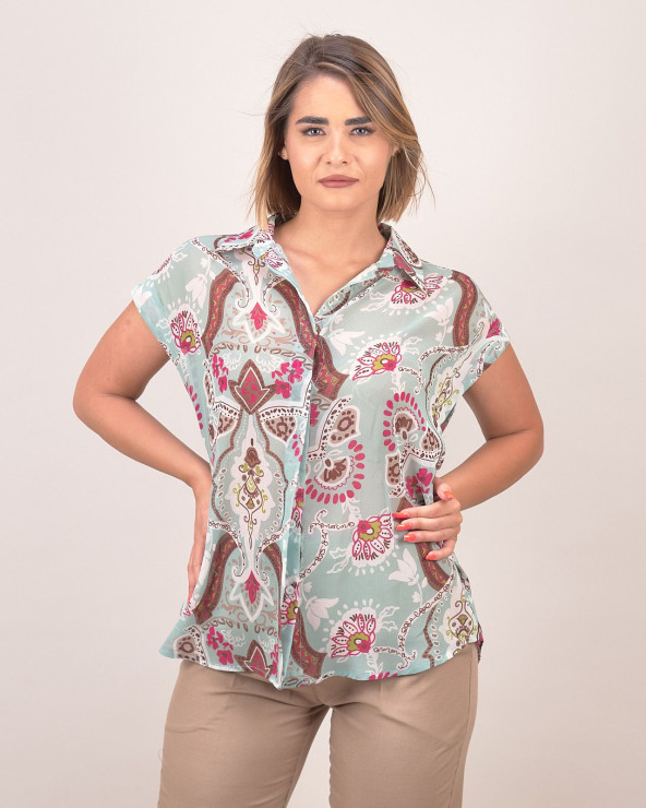 Colora il tuo guardaroba estivo con questa camicia leggera a manica corta, caratterizzata da una vivace stampa cachemire che unisce eleganza e praticità. Il colletto classico e l?abbottonatura frontale la rendono un capo versatile, ideale sia per il tempo libero che per un look casual da ufficio. I toni delicati dell?acqua, del fucsia e del panna valorizzano la silhouette con un tocco boho-chic e raffinato.