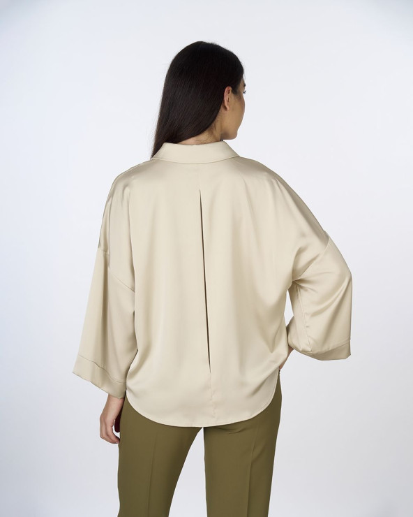 Questa camicia over beige è un capo sofisticato e intramontabile, perfetto per creare look eleganti e versatili. La vestibilità morbida e fluida avvolge la silhouette con naturalezza, garantendo comfort e libertà di movimento. Le maniche ampie a tre quarti e il colletto classico con abbottonatura frontale conferiscono un tocco raffinato, mentre il tessuto regala luminosità e valorizza l’intero outfit.