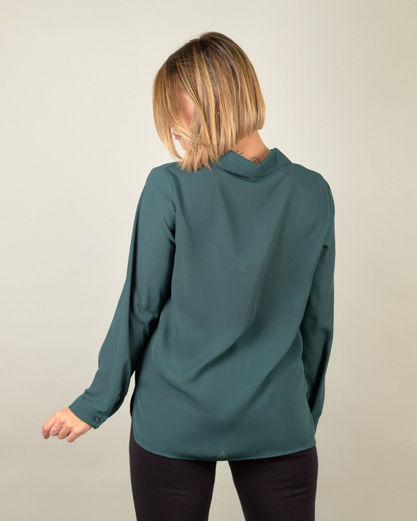 Il design classico con colletto e chiusura a bottoni conferisce uno stile pulito e raffinato, perfetto per creare outfit sia formali che casual. Le maniche lunghe con polsino abbottonato e il taglio leggermente arrotondato sul fondo aggiungono un tocco di femminilità e versatilità.