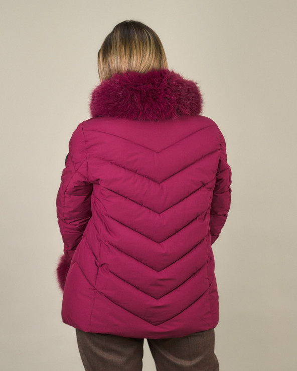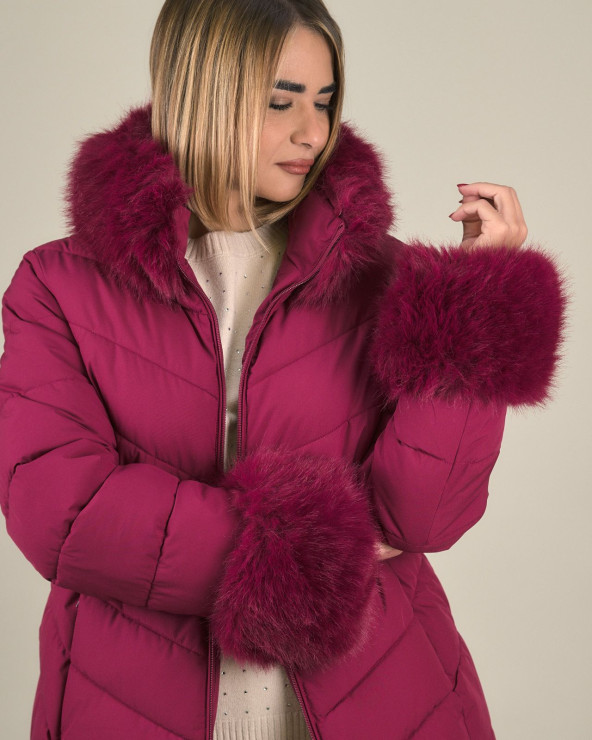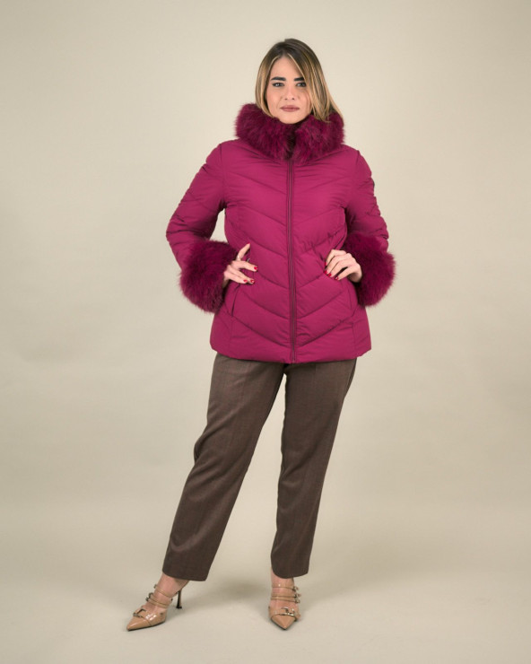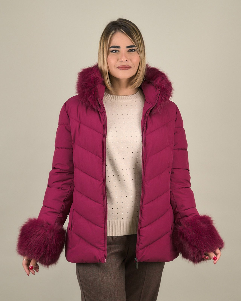 Il piumino con collo e polsi in eco pelliccia unisce calore, eleganza e comfort in un unico capo. Realizzato in tessuto tecnico idrorepellente, presenta un design sfiancato con impunture a V che valorizzano la silhouette curvy e donano un effetto slanciato.