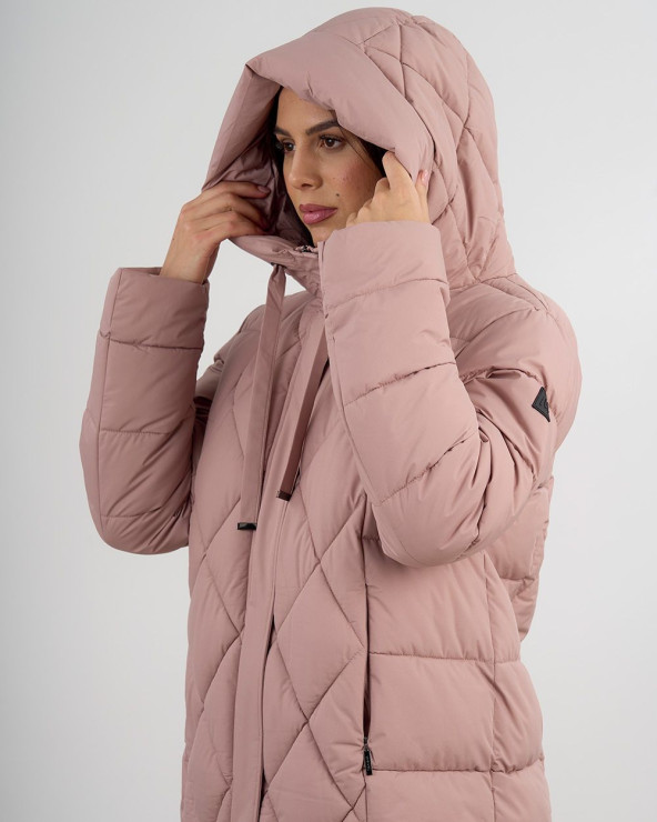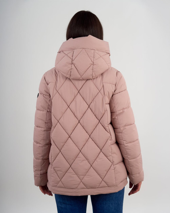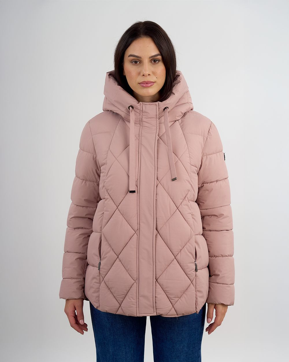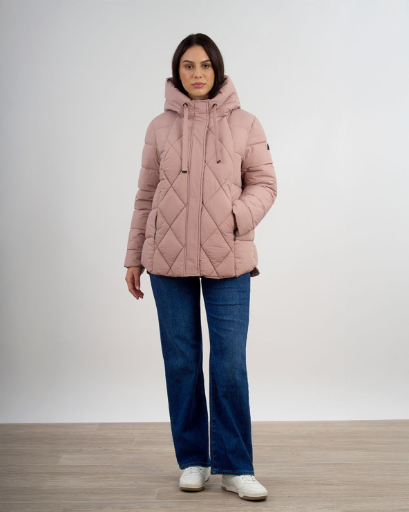 Realizzato in tessuto trapuntato effetto rombo, presenta un ampio cappuccio con coulisse regolabile, chiusura con zip nascosta e tasche laterali con zip.