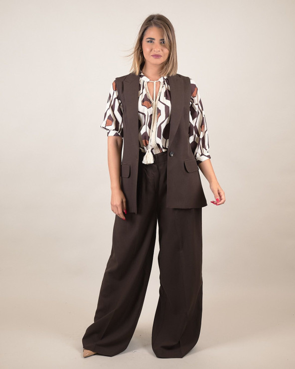 Gilet monopetto realizzato in un raffinato misto lino e viscosa, perfetto per completare look eleganti e contemporanei. Il taglio lungo e dritto valorizza la figura, mentre la chiusura a un bottone singolo e le tasche a patta donano un tocco di stile sartoriale. Ideale da indossare sopra bluse con maniche voluminose o t-shirt aderenti, questo capo è un alleato versatile per la mezza stagione.