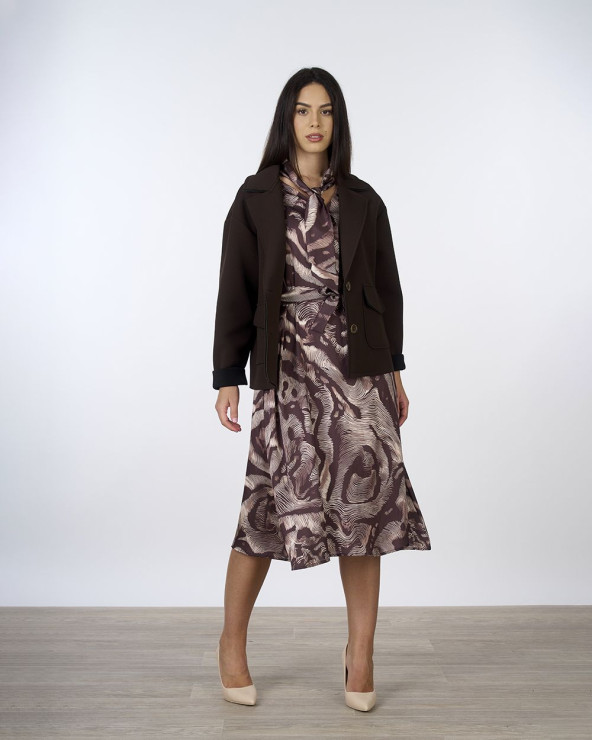 La giacca corta marrone con tasche applicate è un capo versatile e sofisticato, perfetto per arricchire il guardaroba con un tocco di stile contemporaneo. Realizzata in morbido scuba crêpe, offre una vestibilità confortevole e una struttura elegante che valorizza la silhouette. Il design corto e lineare, completato da rever classici e due ampie tasche a pattina frontali, la rende ideale sia per outfit casual che per look più raffinati.
