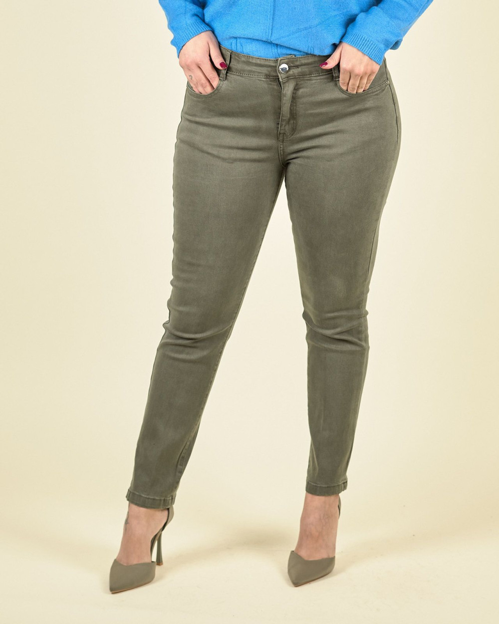 Jeans in tessuto deinm elasticizzato in tinta, modello cinque tasche, vestibilità slim, vita regolare.