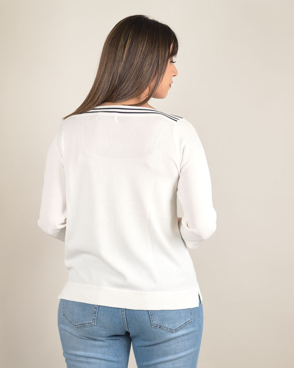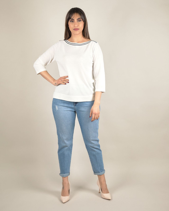 Maglia in filo dallo stile raffinato con scollo a barca impreziosito da un bordo a contrasto. Il tessuto in misto viscosa garantisce una vestibilità morbida e confortevole, perfetta per ogni occasione. Le maniche a tre quarti aggiungono un tocco di eleganza, rendendola ideale sia per look casual che per outfit più sofisticati. Versatile e facile da abbinare, è un capo must-have per ogni guardaroba.