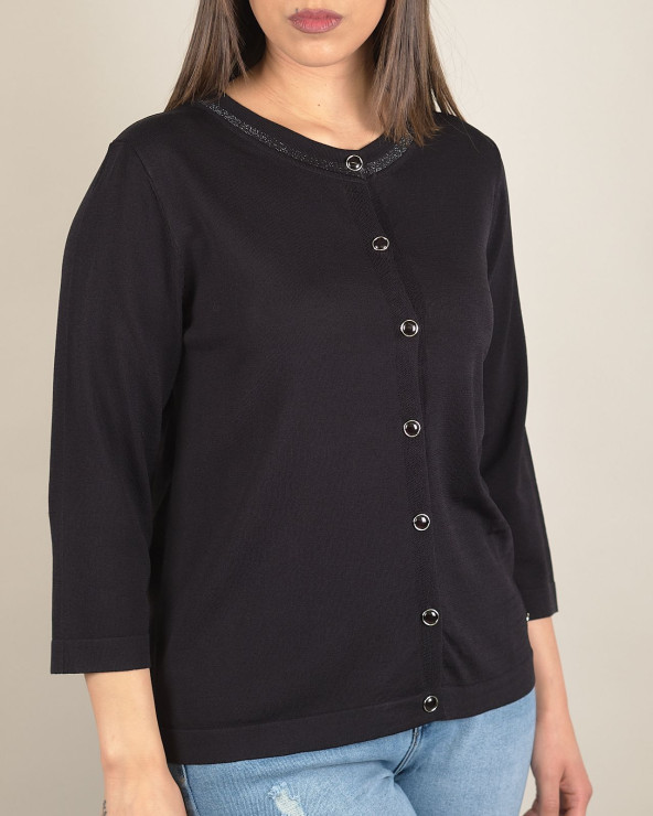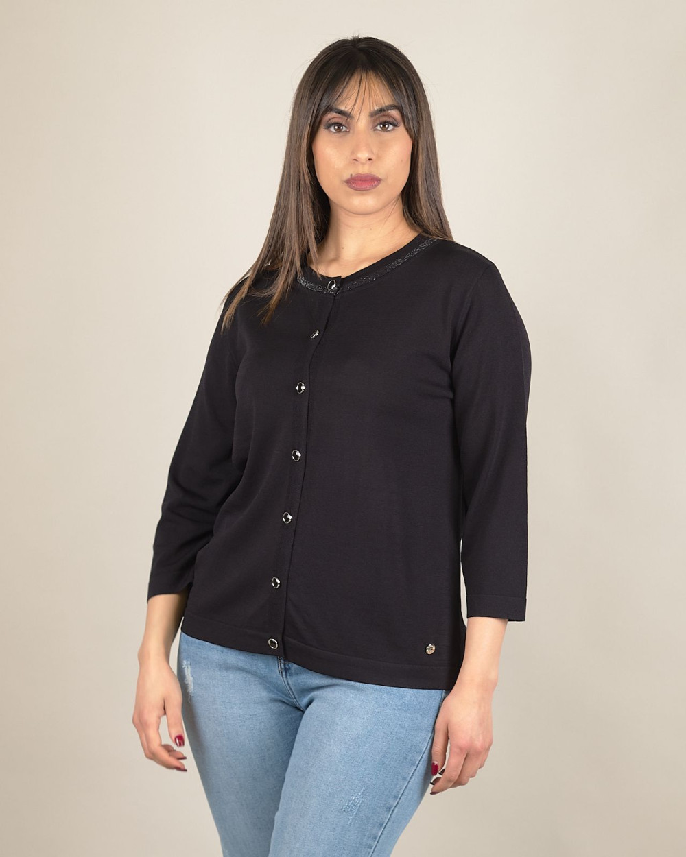 Questo cardigan in filo misto viscosa è il capo ideale per un look elegante e versatile. Il tessuto morbido e leggero avvolge la silhouette con una vestibilità confortevole, perfetta per le mezze stagioni. I dettagli lurex sullo scollo aggiungono un tocco di luminosità, rendendolo adatto sia per il giorno che per la sera. Il design con bottoni frontali permette di indossarlo aperto o chiuso, abbinandolo facilmente a pantaloni, jeans o gonne per un outfit sofisticato e senza tempo.