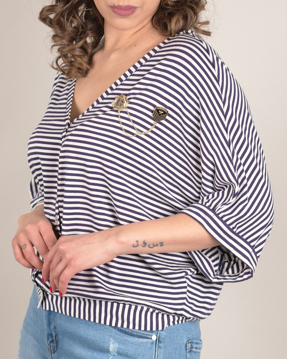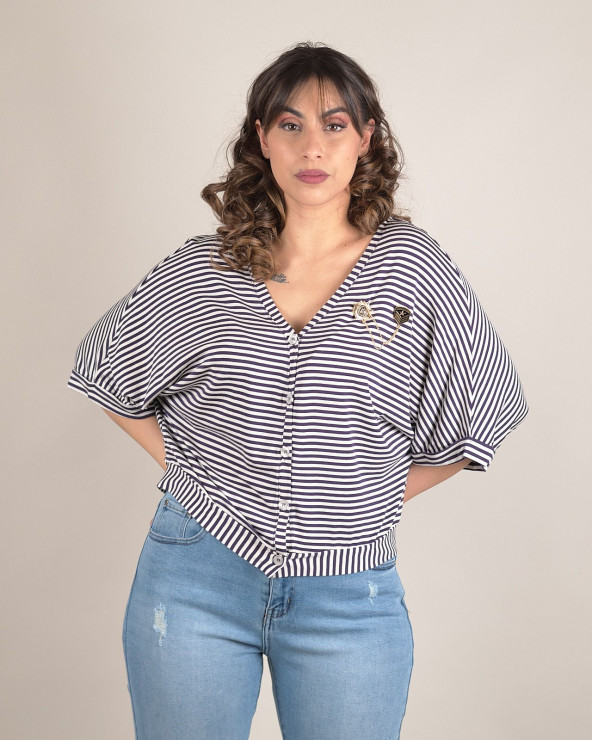 Questa maglia a righe unisce stile casual e dettagli raffinati per un look versatile e di tendenza. Il motivo a righe orizzontali su sfondo blu e bianco crea un effetto dinamico, mentre i bottoni decorativi sul davanti aggiungono un tocco distintivo. La vestibilità morbida e il tessuto leggero in viscosa con elastan garantiscono massimo comfort e libertà di movimento. Ideale da abbinare a jeans o pantaloni casual per un look moderno, adatto sia per il tempo libero che per le occasioni informali.