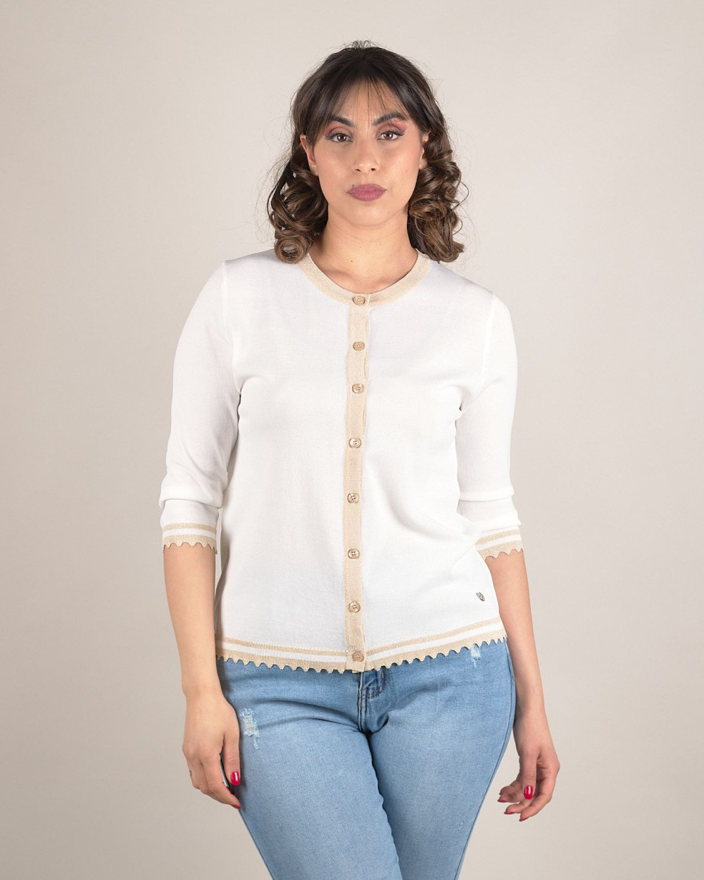 Elegante e raffinato, questo cardigan con bordi a contrasto è un capo versatile da abbinare ai tuoi outfit quotidiani. Realizzato in morbida viscosa ed elastan, garantisce comfort e vestibilità perfetta. I dettagli a contrasto con finiture ondulate aggiungono un tocco di stile e originalità, rendendolo ideale sia per look casual che più ricercati. Perfetto da indossare sopra camicie o top per un effetto chic e femminile.