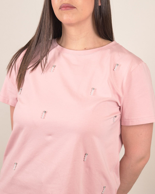 T-shirt con perle e strass applicati