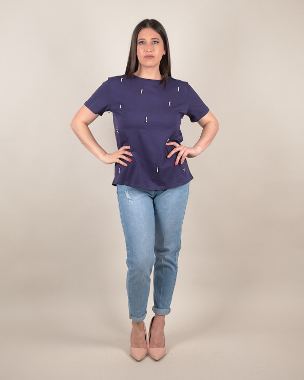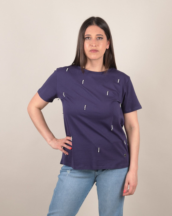 T-shirt con perle e strass applicati