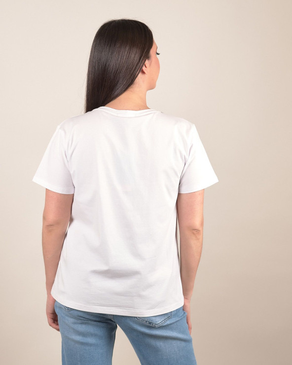 Rendi unico il tuo outfit con questa t-shirt in morbido cotone elasticizzato, perfetta per chi ama distinguersi con stile. Il dettaglio gioiello applicato allo scollo aggiunge un tocco di luce e femminilità, trasformando un capo basic in un elemento raffinato e ricercato. La vestibilità confortevole e il taglio regolare la rendono ideale sia per un look casual con jeans che per uno più elegante con pantaloni o gonne. Il tessuto elasticizzato garantisce massimo comfort e libertà di movimento in ogni momento della giornata.