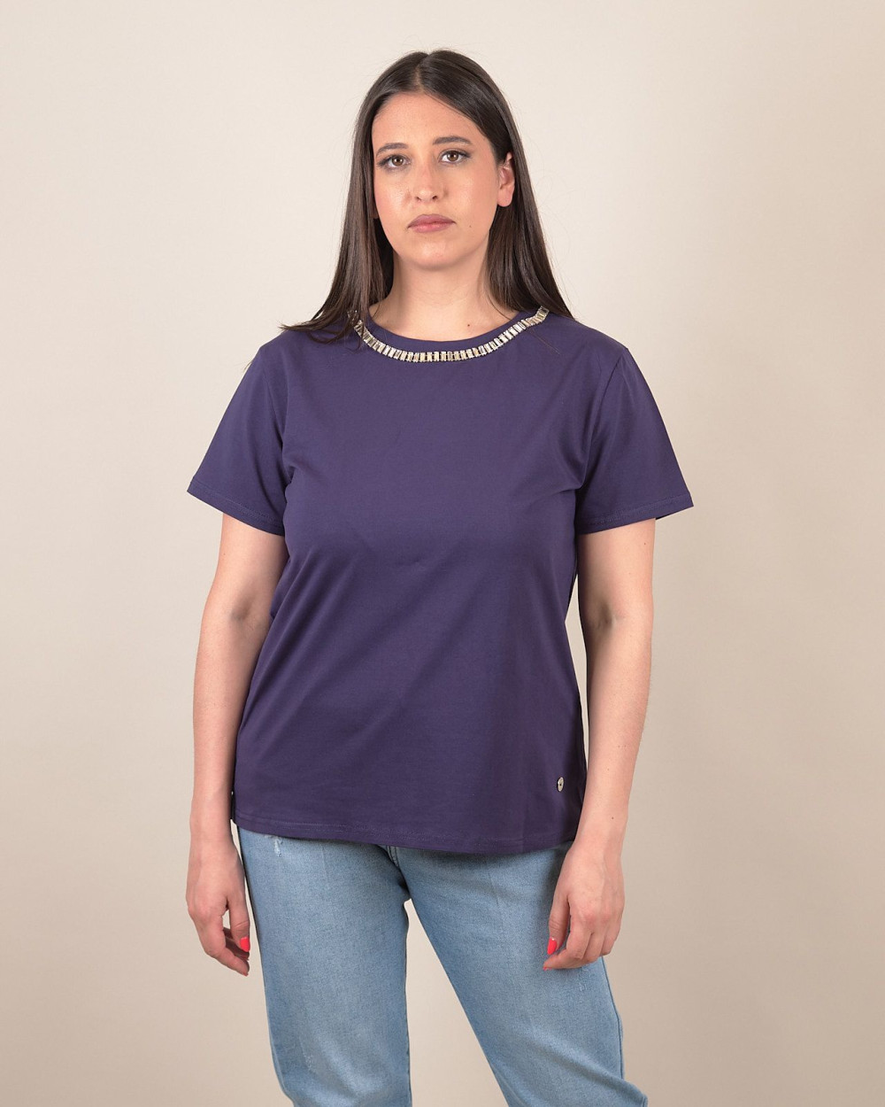 Rendi unico il tuo outfit con questa t-shirt in morbido cotone elasticizzato, perfetta per chi ama distinguersi con stile. Il dettaglio gioiello applicato allo scollo aggiunge un tocco di luce e femminilità, trasformando un capo basic in un elemento raffinato e ricercato. La vestibilità confortevole e il taglio regolare la rendono ideale sia per un look casual con jeans che per uno più elegante con pantaloni o gonne. Il tessuto elasticizzato garantisce massimo comfort e libertà di movimento in ogni momento della giornata.
