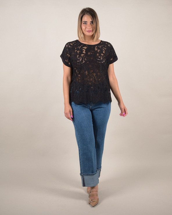 Maglia dallo stile romantico in pregiato pizzo macramè, realizzata in 100% cotone per offrire freschezza e leggerezza. Il design raffinato è valorizzato da un motivo traforato con bordi smerlati, perfetto per chi desidera aggiungere un tocco elegante e femminile ai propri outfit estivi.