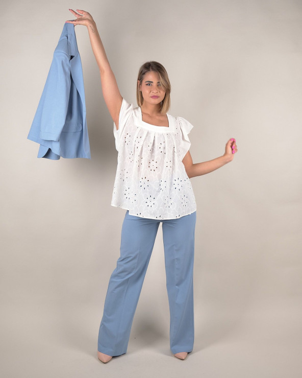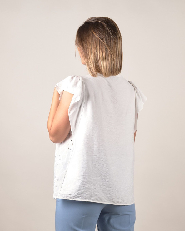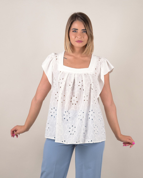 Top in puro cotone dal design fresco e romantico, caratterizzato da una raffinata lavorazione sangallo con motivo floreale traforato. Il modello presenta uno scollo quadrato che valorizza la linea del décolleté e maniche corte a volant che aggiungono leggerezza e movimento.
