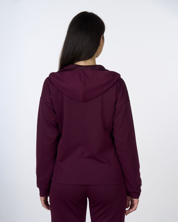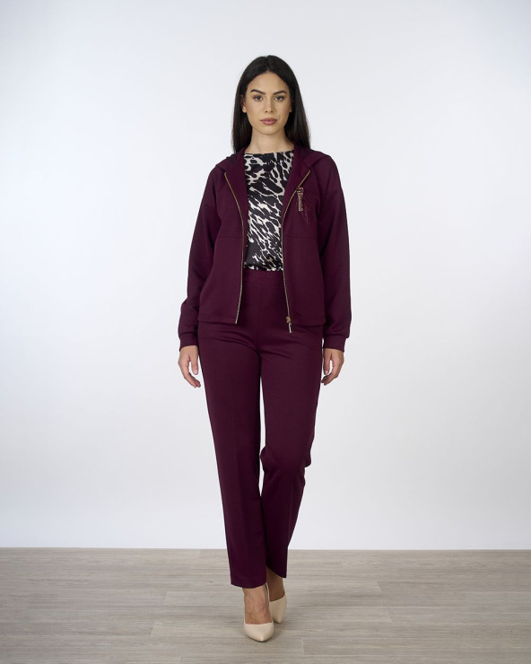 La felpa bordeaux con cappuccio è un capo versatile e contemporaneo, pensato per chi desidera unire comfort e stile. Realizzata in tessuto scuba crêpe elasticizzato, garantisce morbidezza al tatto e una vestibilità confortevole che segue i movimenti senza costrizioni. Il design con zip dorata frontale aggiunge un tocco sofisticato, mentre il cappuccio e le pratiche tasche laterali ne esaltano la funzionalità quotidiana.