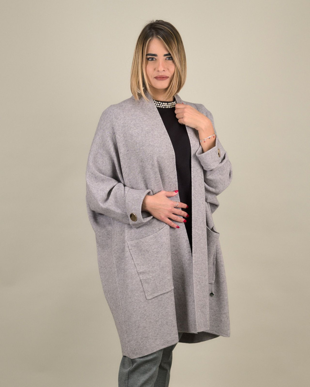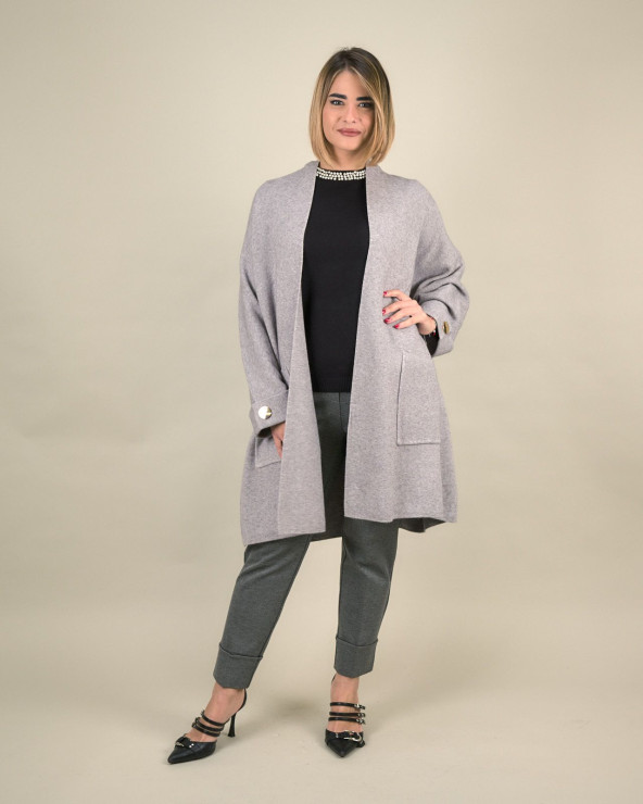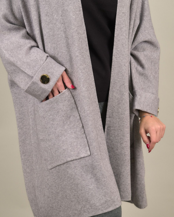 Lo spolverino over con bottoni decorativi è un capo raffinato e versatile, ideale per completare con eleganza i look di stagione. Realizzato in un morbido tessuto misto viscosa, modal ed elastan, assicura comfort e una vestibilità fluida e avvolgente. Il design ampio e senza chiusura frontale valorizza la silhouette con leggerezza, mentre i bottoni metallici sui polsini aggiungono un dettaglio ricercato e contemporaneo.