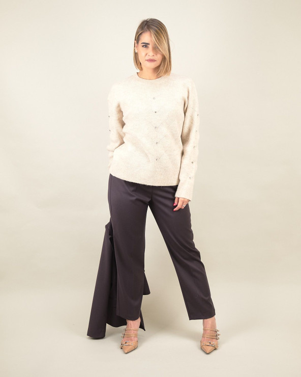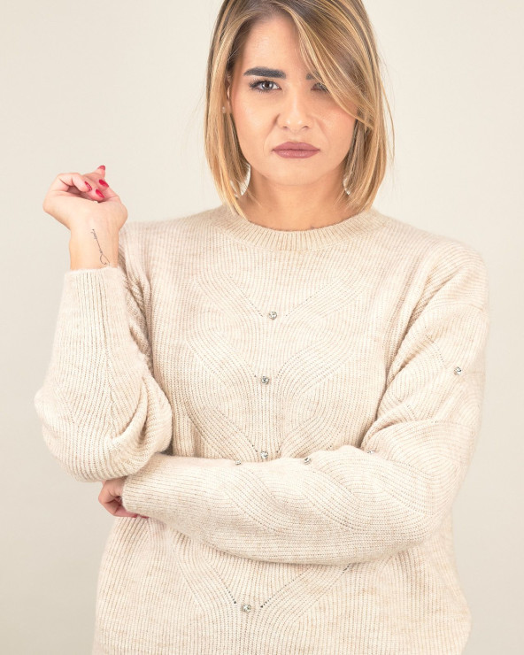 Il modello presenta una lavorazione a costine con motivo decorativo frontale arricchito da piccole perle applicate, che aggiungono un dettaglio luminoso e sofisticato. Il girocollo e il taglio regolare la rendono versatile e facile da abbinare sia a pantaloni eleganti che a jeans casual.
