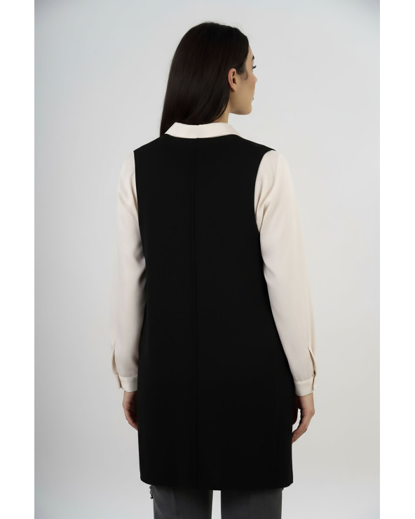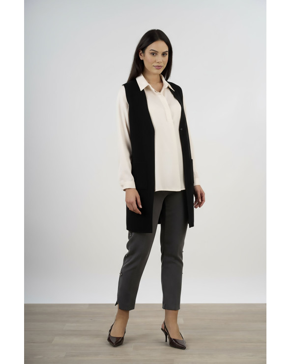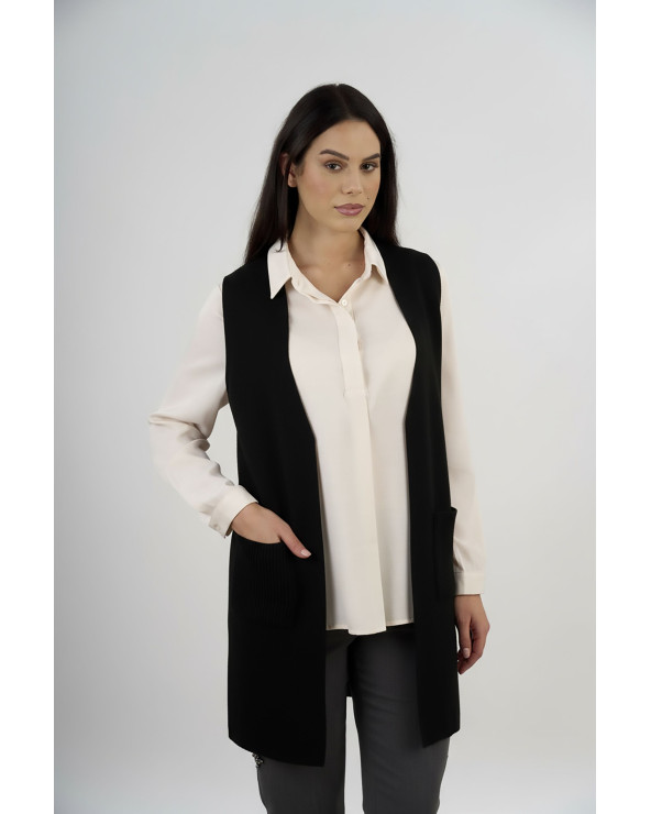 Gilet lungo in maglia fine, dal design elegante e versatile. Realizzato in un tessuto morbido ed elasticizzato, questo capo si adatta perfettamente alla silhouette offrendo comfort e libertà di movimento.