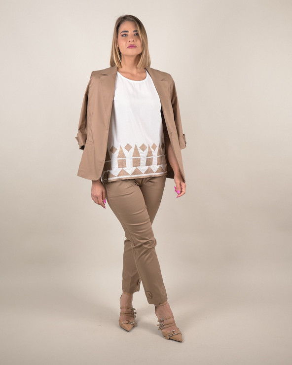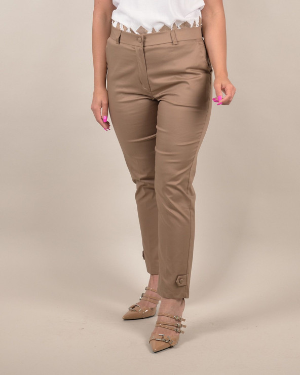 Essenziali ma ricercati, questi pantaloni in cotone elasticizzato rappresentano la perfetta unione tra comfort e stile. Il taglio asciutto valorizza la silhouette senza rinunciare alla praticità, mentre il dettaglio del bottone applicato al fondo gamba aggiunge un tocco sartoriale e contemporaneo. Ideali per completare sia look quotidiani che più curati, si abbinano perfettamente a bluse fluide, t-shirt o blazer. La chiusura frontale e i passanti in vita li rendono adatti anche a cinture per un fit personalizzato.