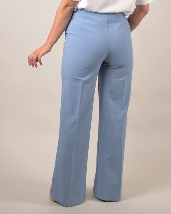 Pantaloni dritti realizzati in un raffinato misto di viscosa e cotone, ideali per un look curvy elegante e senza tempo. Il taglio lineare e la tinta color polvere conferiscono un tocco di sobria raffinatezza, perfetto per il lavoro o le occasioni speciali. Il modello presenta una vita regolare con chiusura a bottone e zip, comode tasche laterali e linea pulita sulla gamba, valorizzando la silhouette con discrezione.