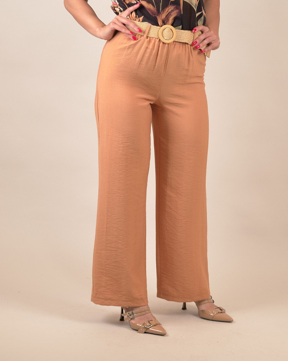 Il modello presenta una fascia elastica in vita che assicura una vestibilità comoda e versatile, perfetta per ogni silhouette. La linea dritta della gamba slancia la figura, rendendo questi pantaloni facili da abbinare a top fluidi, camicie stampate o bluse leggere.