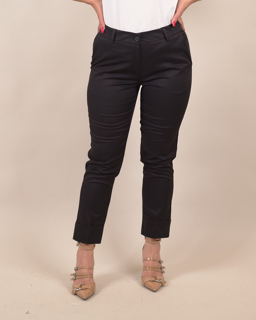 La piega centrale stirata dona un tocco sartoriale e slancia visivamente la figura, rendendo questi pantaloni perfetti sia per il lavoro che per occasioni casual chic. La chiusura con bottone e zip, i passanti per cintura e le tasche laterali completano un modello essenziale e versatile.