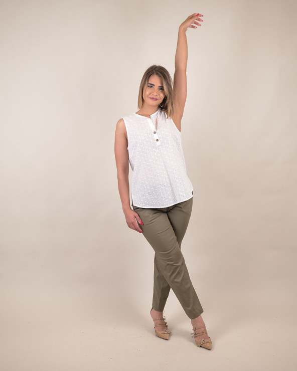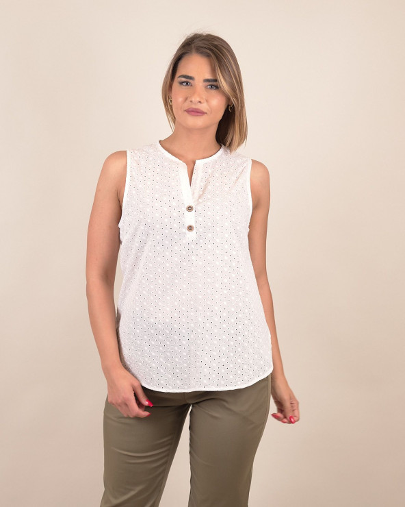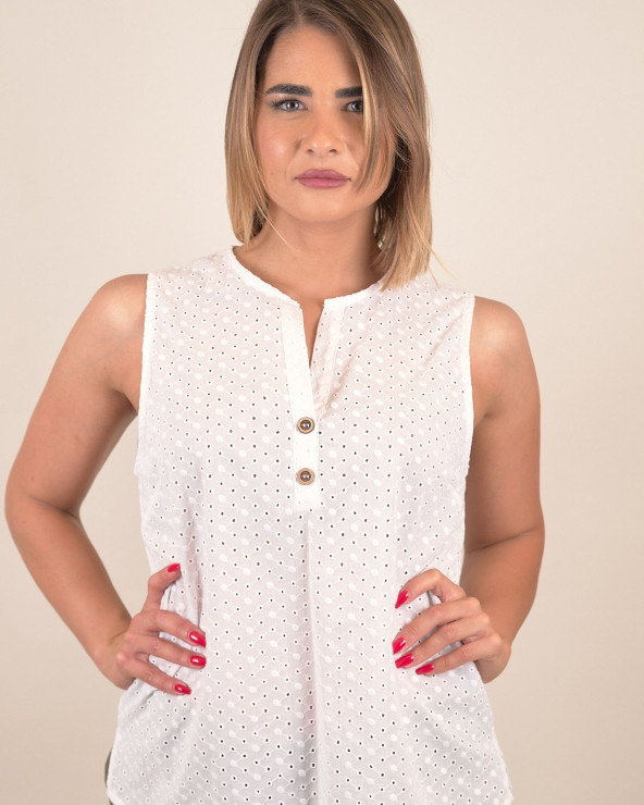Fresco e femminile, questo top smanicato in 100% cotone è un must-have per l’estate. Il tessuto sangallo dona un effetto traforato delicato e romantico, perfetto per valorizzare ogni outfit con un tocco raffinato. Il modello presenta uno scollo a V con abbottonatura decorativa frontale e taglio leggermente svasato che cade morbido sui fianchi, assicurando comfort e vestibilità ottimale anche alle silhouette curvy.