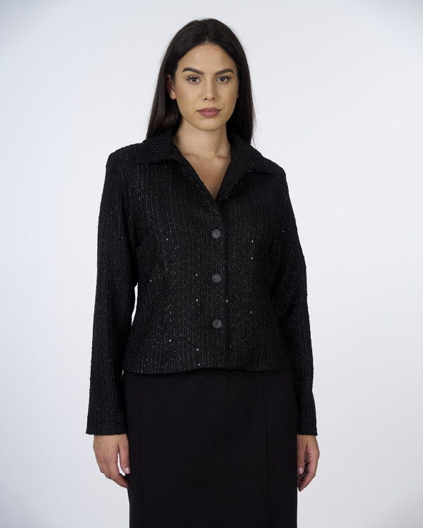 Questa giacca nera elegante con paillettes è il capo perfetto per chi desidera unire raffinatezza e luminosità. Realizzata in tessuto confortevole...