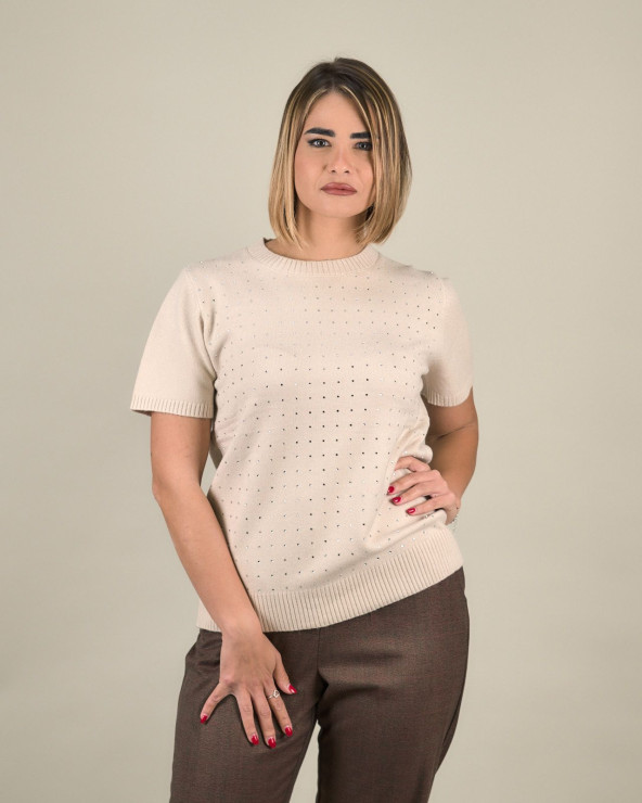 Descrizione estesa: La maglia con strass unisce semplicità ed eleganza, perfetta per aggiungere un tocco luminoso ai tuoi outfit quotidiani....