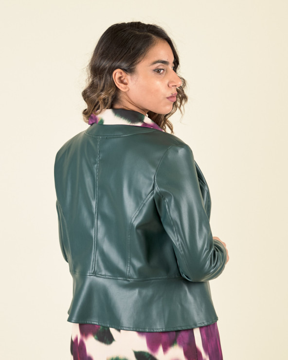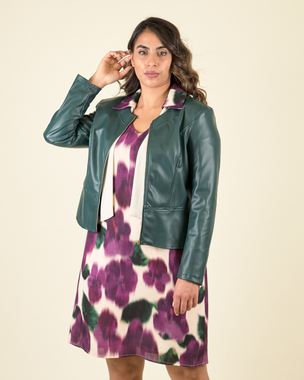 Giacca corta in ecopelle lucido, scollo rotondo, chiusura con zip, parte inferiore leggermente svasata.