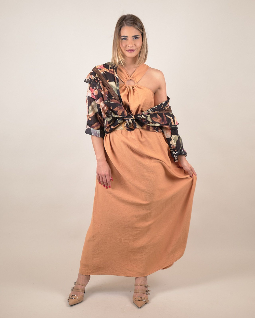La vestibilità è fluida e leggera, ideale per chi cerca comfort senza rinunciare allo stile. Il colore arancione caldo aggiunge vivacità e femminilità al look, rendendo questo abito una scelta versatile sia per il giorno che per la sera. Da abbinare a sandali bassi per un look casual o a tacchi alti per un effetto più sofisticato.